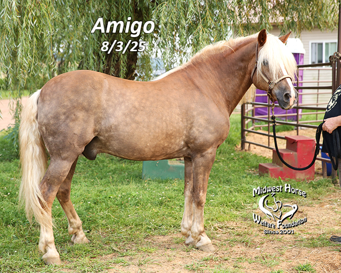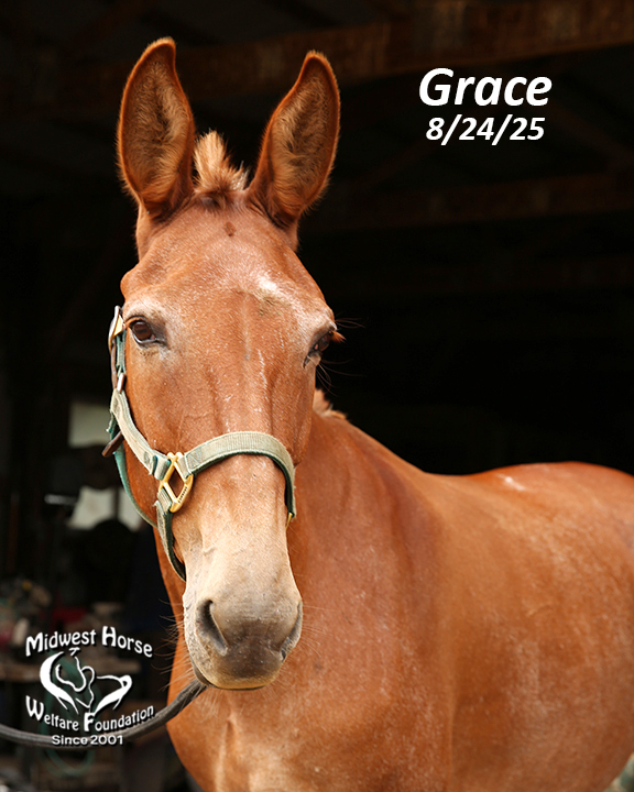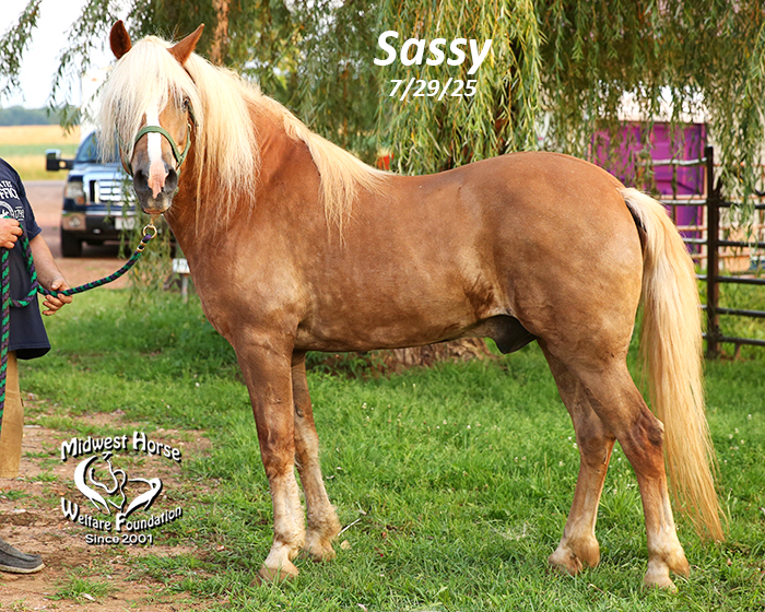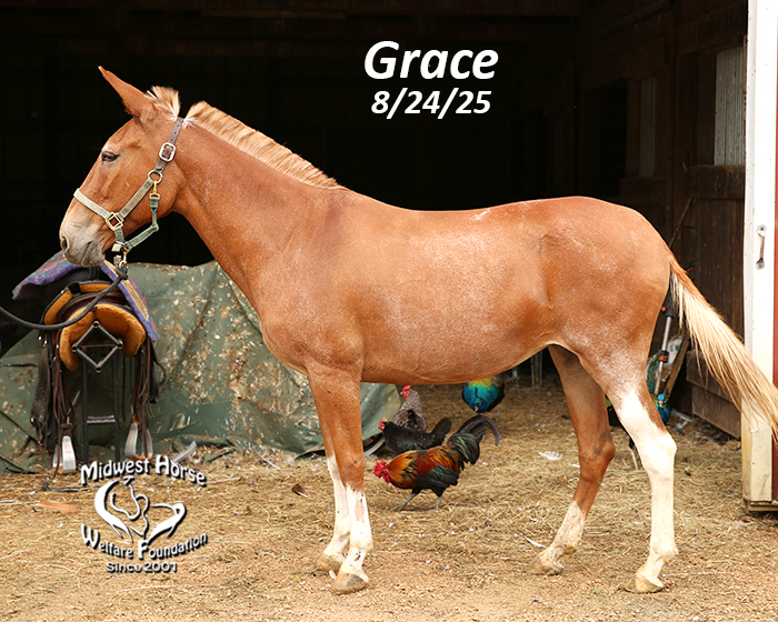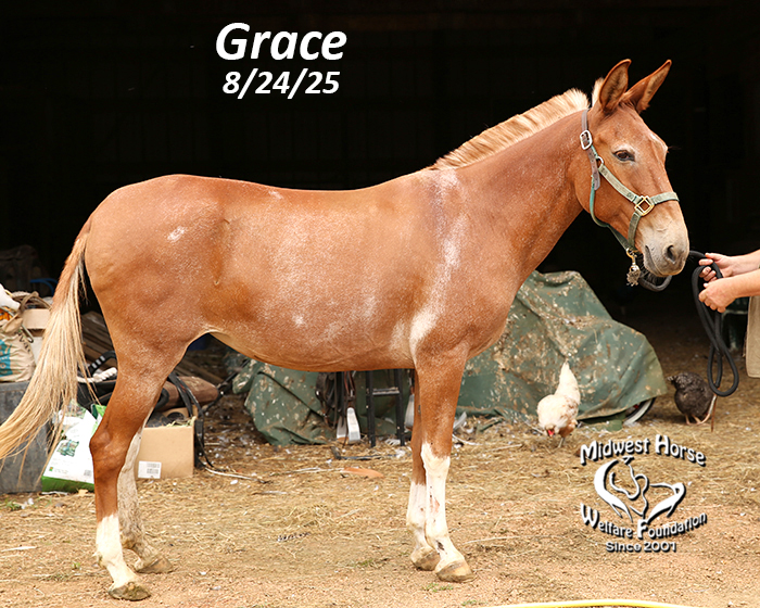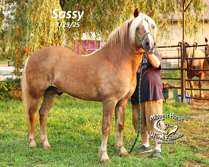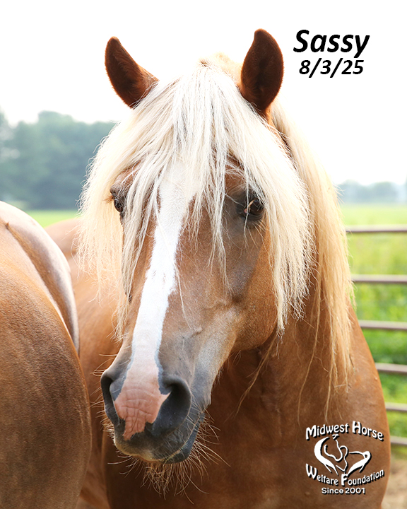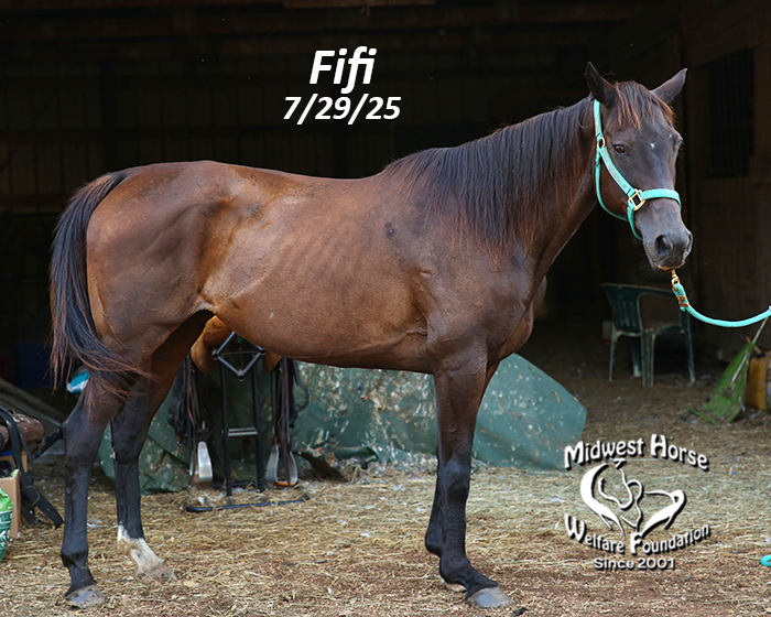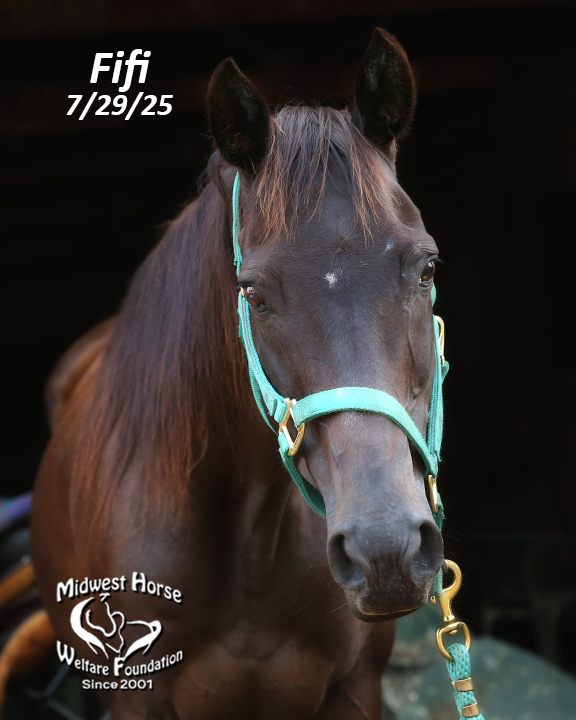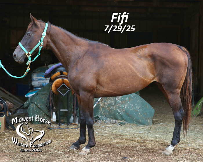 Fifi was adopted in 2024 but was not getting along with her pasture mate. She gets along great with her herd mates here, but for whatever reason, she did not like her pasture mate in her adoptive home, so she is back at MHWF and looking for a nice place to retire and live the good life.
