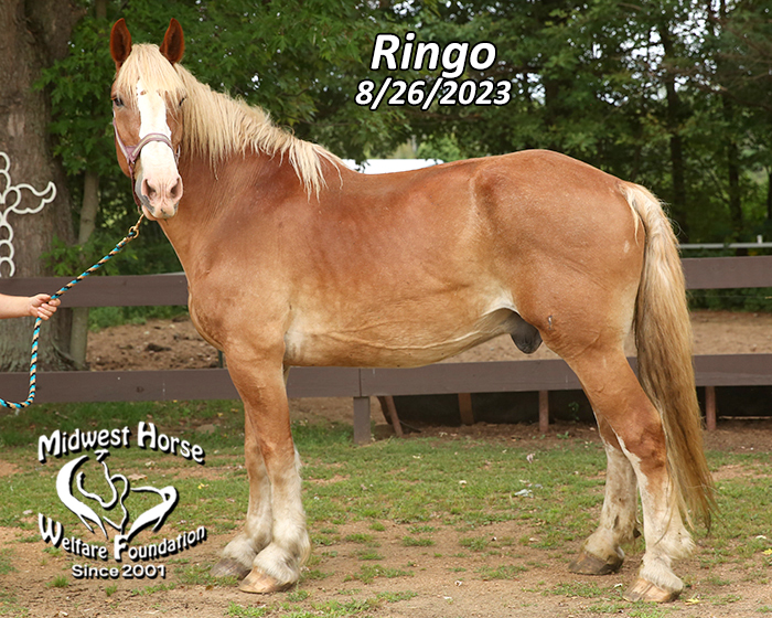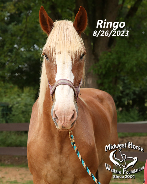 $400 - Ringo is a 25 year old Belgian gelding. He is a big guy at 17 hands tall and is still sound and healthy. You may remember Ringo when he came into our program 3 years ago, along with his partner, George. Sadly, George passed away and Ringo is back with us at MHWF. What can we say about this big guy? He gets along with everyone and does not have a mean bone in his body. Ringo does not have much left for teeth, so he needs to get his grain twice per day and plenty of pasture since he cannot eat hay. Because of his size, he automatically becomes the herd leader in the pasture and he is a very good and very wise one. We are hoping that there is someone out there who is willing to give him a safe place to live out the rest of his life, someone with no expectations of him working and someone who is willing to grain him like he needs to be. His adoption fee might be negotiable for the right home. He's a sweet old guy who lost his life-long buddy and needs a pasture to call home. Is that you?